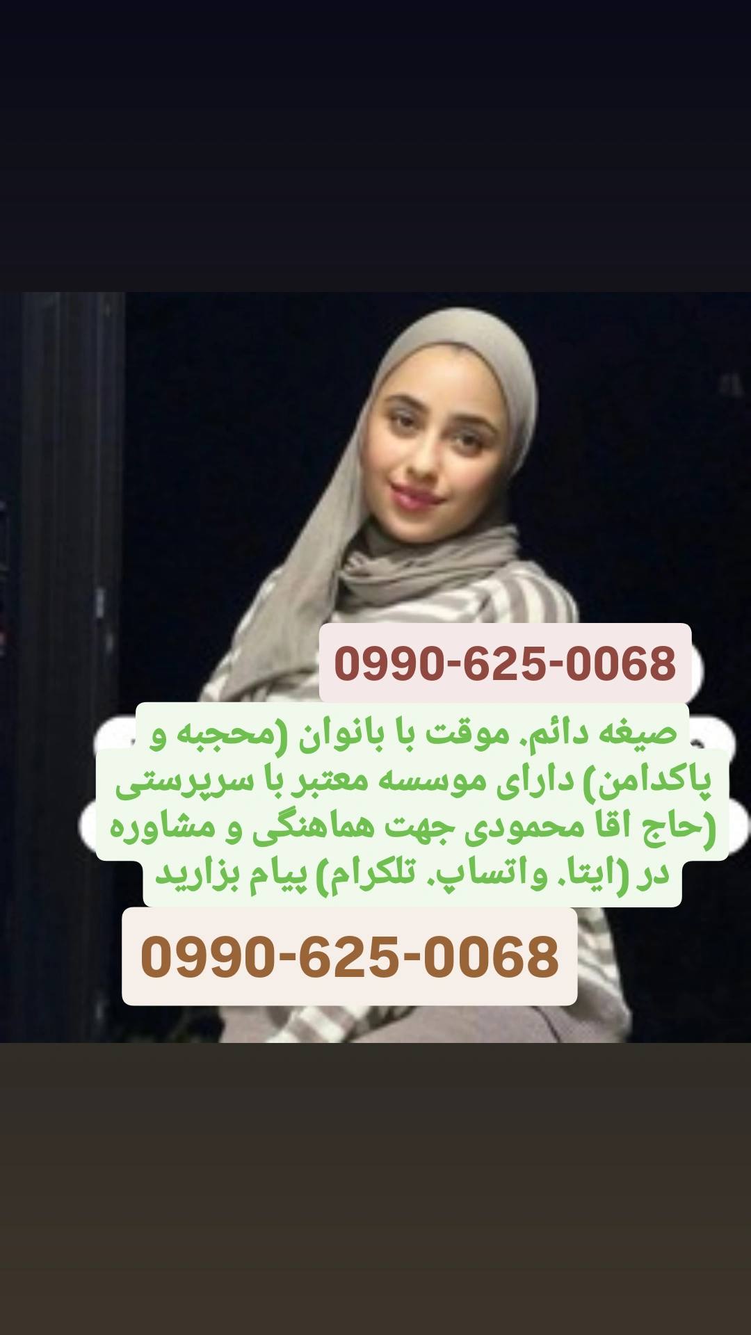 مرکز صیغه یابی و همسریابی حاج اقا محمدی هستم مورد زن پاکدامن و با تقوا مطلقه و.. همراه با مکان جهت هماهنگی بیشتر واتساپ. ایتا. یا تلگرام پیام دهید 09054473492